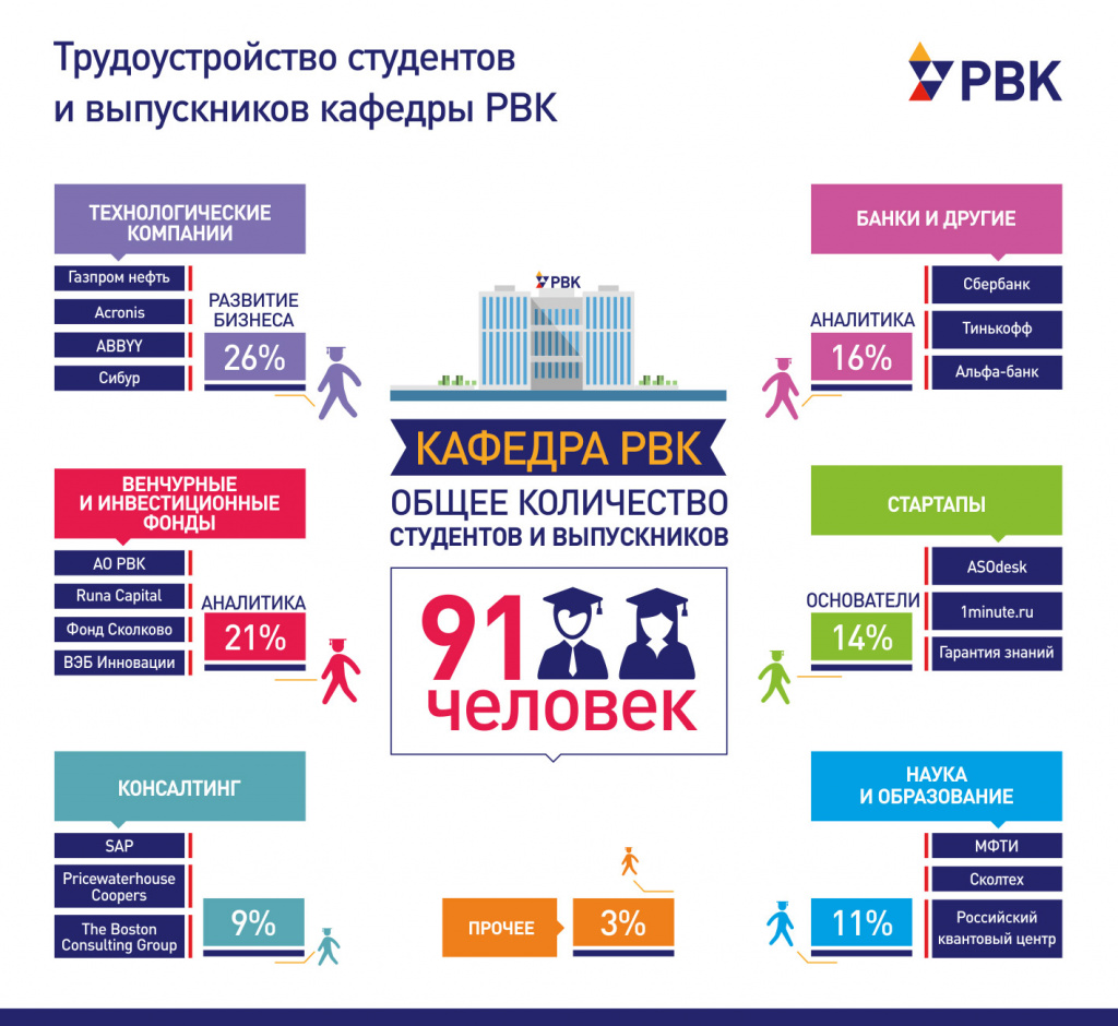 Современное образование должно отвечать запросам рынка, а учебные заведения — готовить специалистов, востребованных ведущими компаниями. На кафедре РВК в МФТИ преподавателями работают сильные практики, дающие знания на примере реальных кейсов. Во время обучения студенты получают опыт работы в «полевых» условиях венчурного рынка. На выходе выпускников кафедры ждут позиции в крупнейших игроках отрасли или путь основателей собственного бизнеса. В каких направлениях чаще всего двигаются молодые специалисты — наглядно на инфографике.