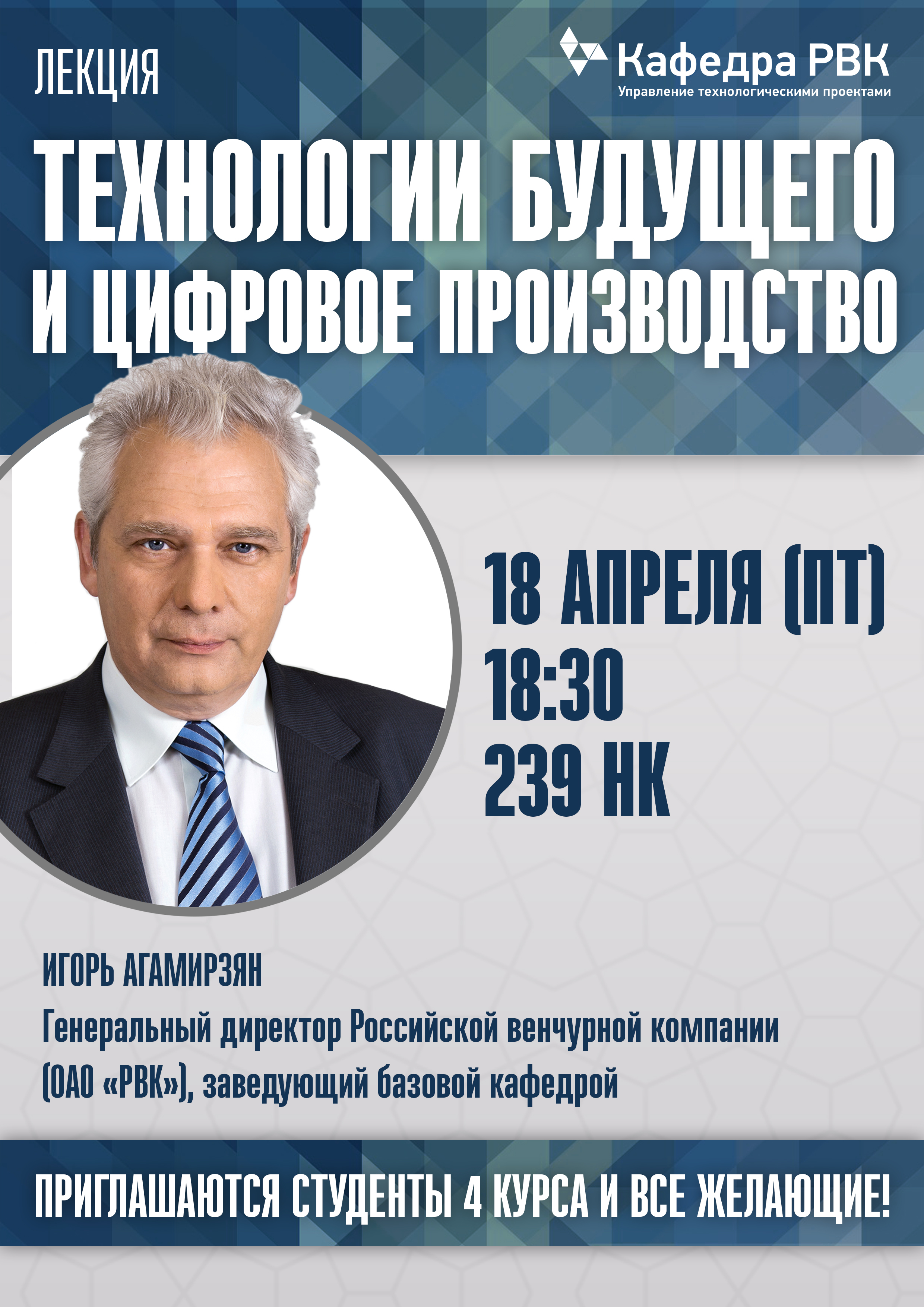 18 апреля в 18:30 в аудитории 239 НК состоится встреча генерального директора Российской венчурной компании (ОАО «РВК»), заведующего базовой кафедрой ФИВТ «Управление технологическими проектами» Игоря Агамирзяна со студентами.